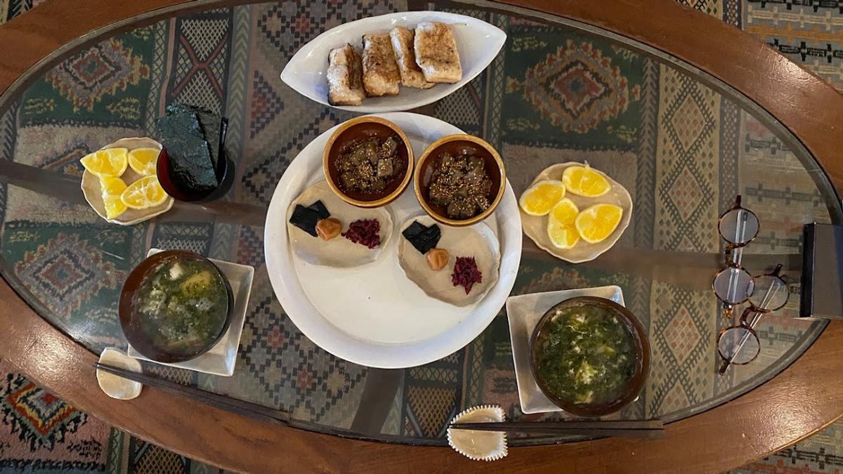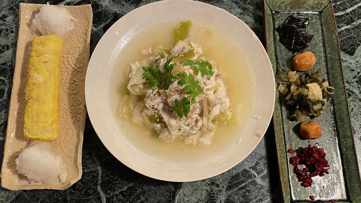 卵焼き、漬物と梅干し、真鯛のアラと白菜の煮物、