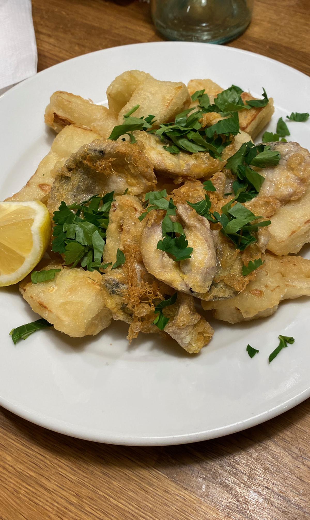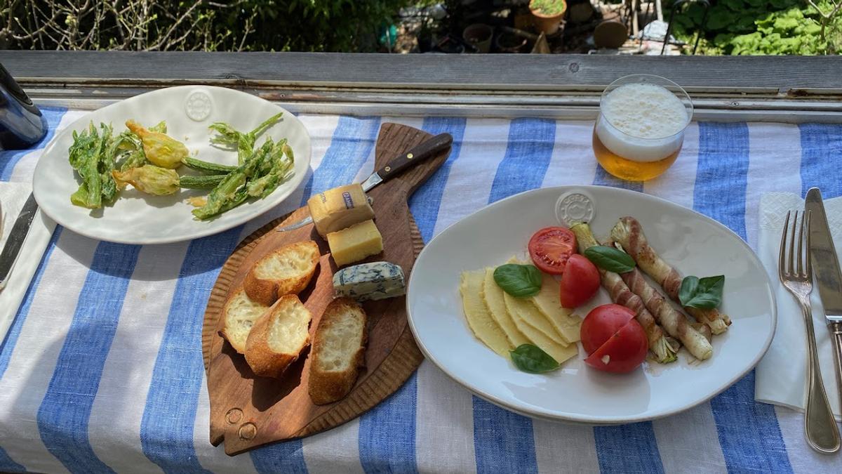 ズッキーニの花とタラの芽のフリット。オーブンで焼いた筍とトマトと長ネギの肉巻き焼き&チーズ3種、