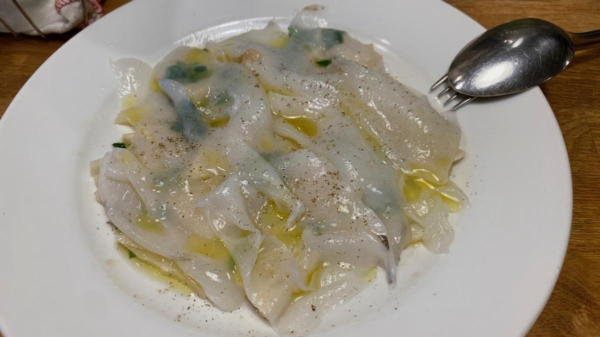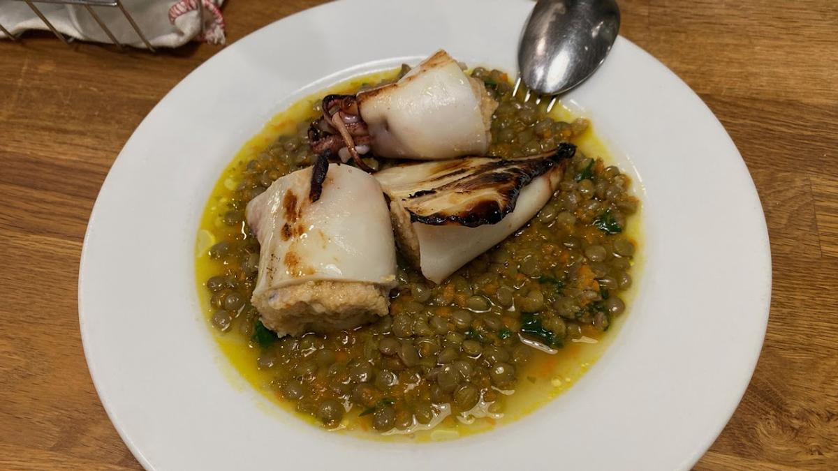 筍とヤリイカのカルパッチョ、ヤリイカのファルシー(レンズ豆ベース)、
