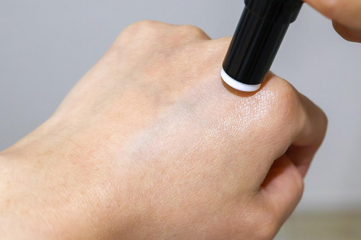 化粧水を塗った手に「ピンポイントセバムオフ スティック」を使った様子
