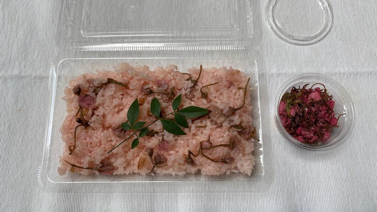寝坊したのはもちろんです。ご近所の新倉邦子さんからいただいた「桜ごはん」と「桜の塩漬け」をお弁当に。