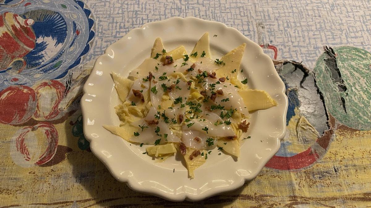 焼いた筍の薄切りとヤリイカのカルパッチョ。