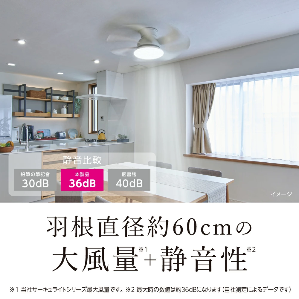一方で、最大風量時でも36dBと図書館レベルの静かさを実現。大風量でありながら生活音を邪魔しない仕様です。