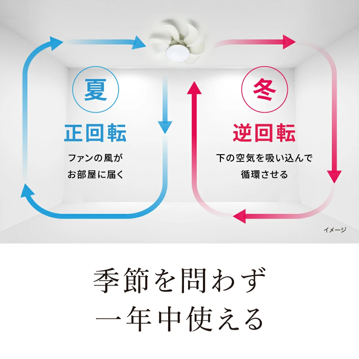 正回転・逆回転の切り替えにより、夏は涼風、冬は暖気循環とオールシーズン対応。体感温度を約3°C調整し、冷暖房効率の改善にも寄与します。