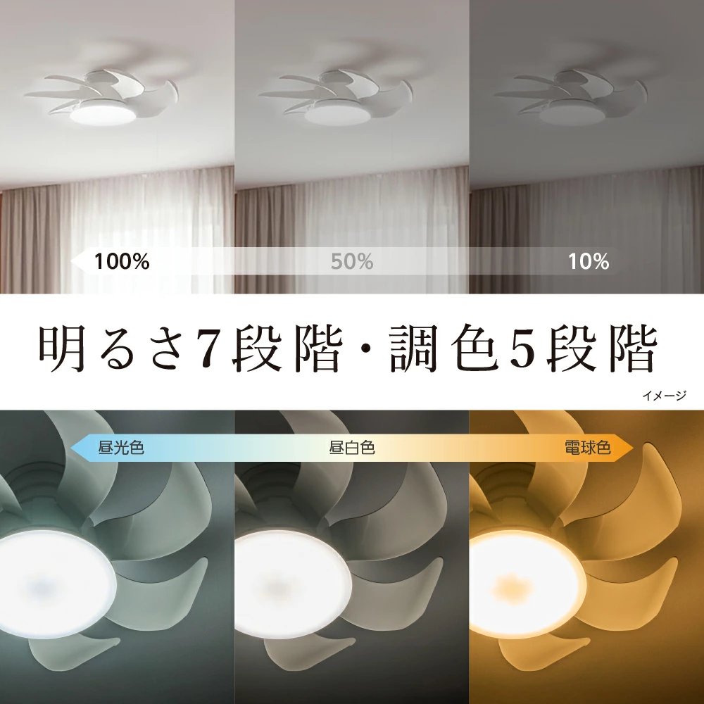 サーキュレーターとLEDライトが一体化しているため、空間の中央から効率よく光と風を届けるのも利点。調光7段階・調色5段階でシーンに応じた明るさ調整もできます。