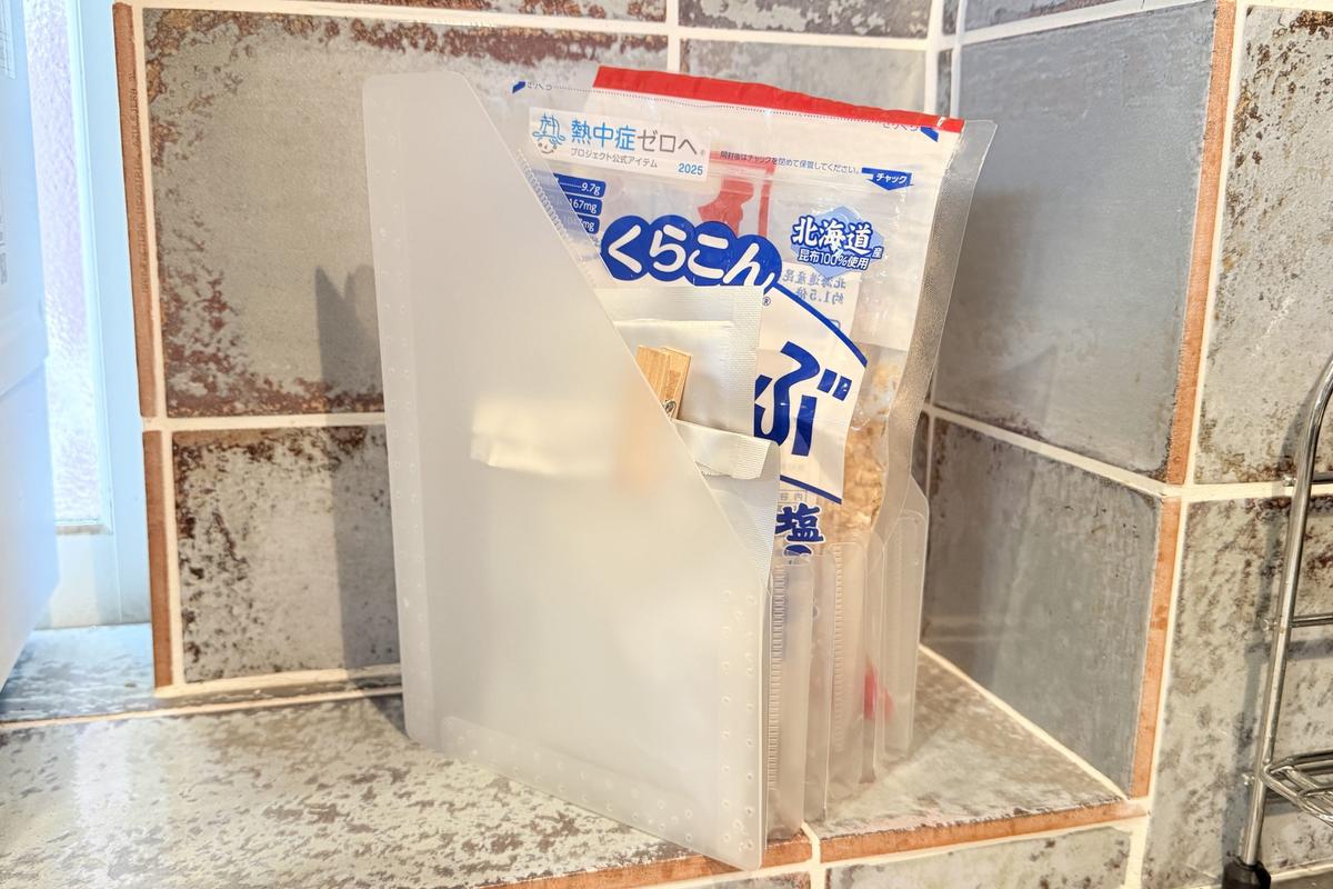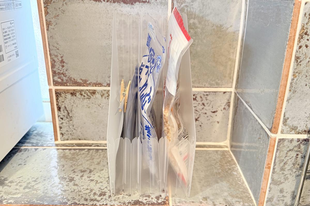 筆者は塩昆布やごま、小袋の乾物や調味料など、袋タイプの食品を収納するのに使っています。引き出しに寝かせると埋もれがちなものも、立てて並べることで一目で把握できるようになりました。