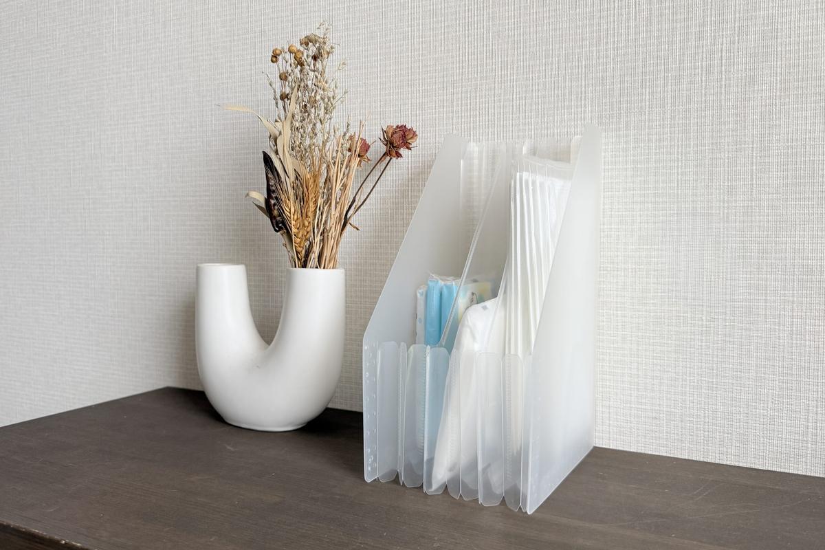 「とりあえず、ここに置いておこう」そんな微妙なポジションのものたちを無理なく整えてくれるアイテムが、無印良品にあるんです。それが「ポリプロピレン スタンドじゃばらファイル」。