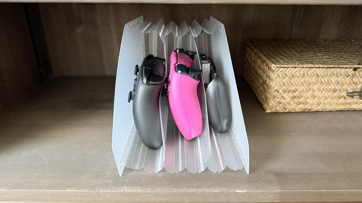 夫婦そろってゲームが好きなわが家では、コントローラーの置き場所にもずっと悩んでいたのですが、ためしにこのファイルに入れてみたところ、これが想像以上にしっくりきたのです。立てて収納できるので見た目もすっきりして、取り出しやすさもきちんとキープできました。