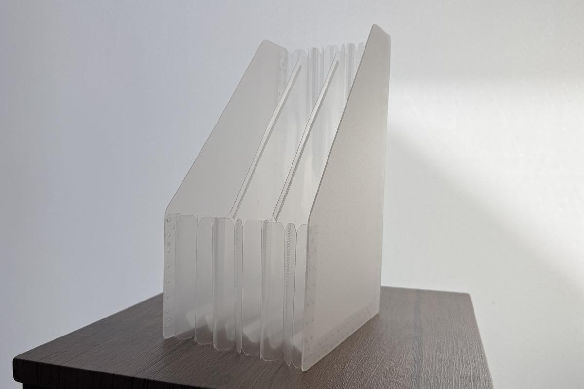 設置の手軽さもこのファイルのメリットのひとつ。折りたたまれた状態から両手で広げると、それだけでマチ付きの簡易収納棚のような形になります。