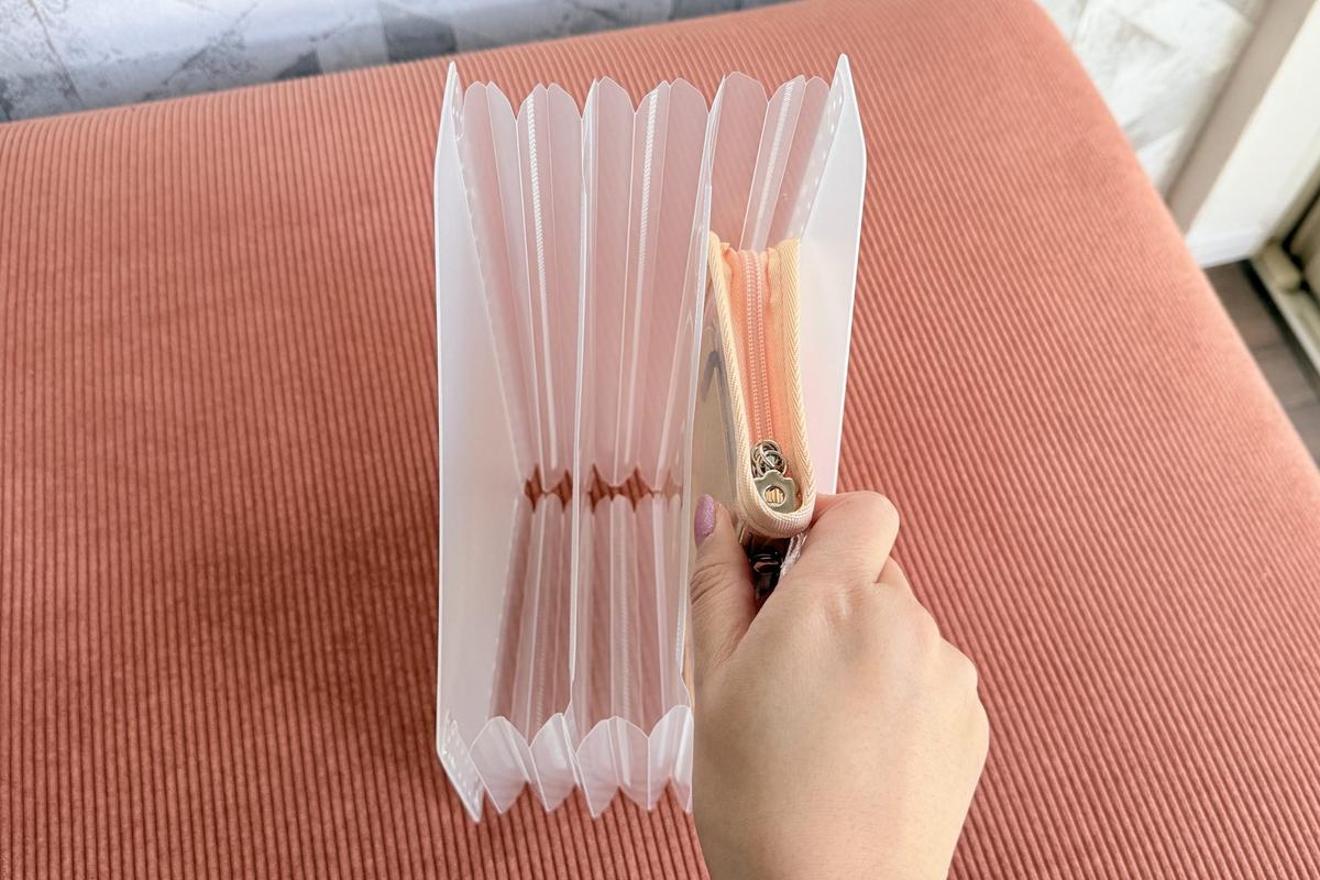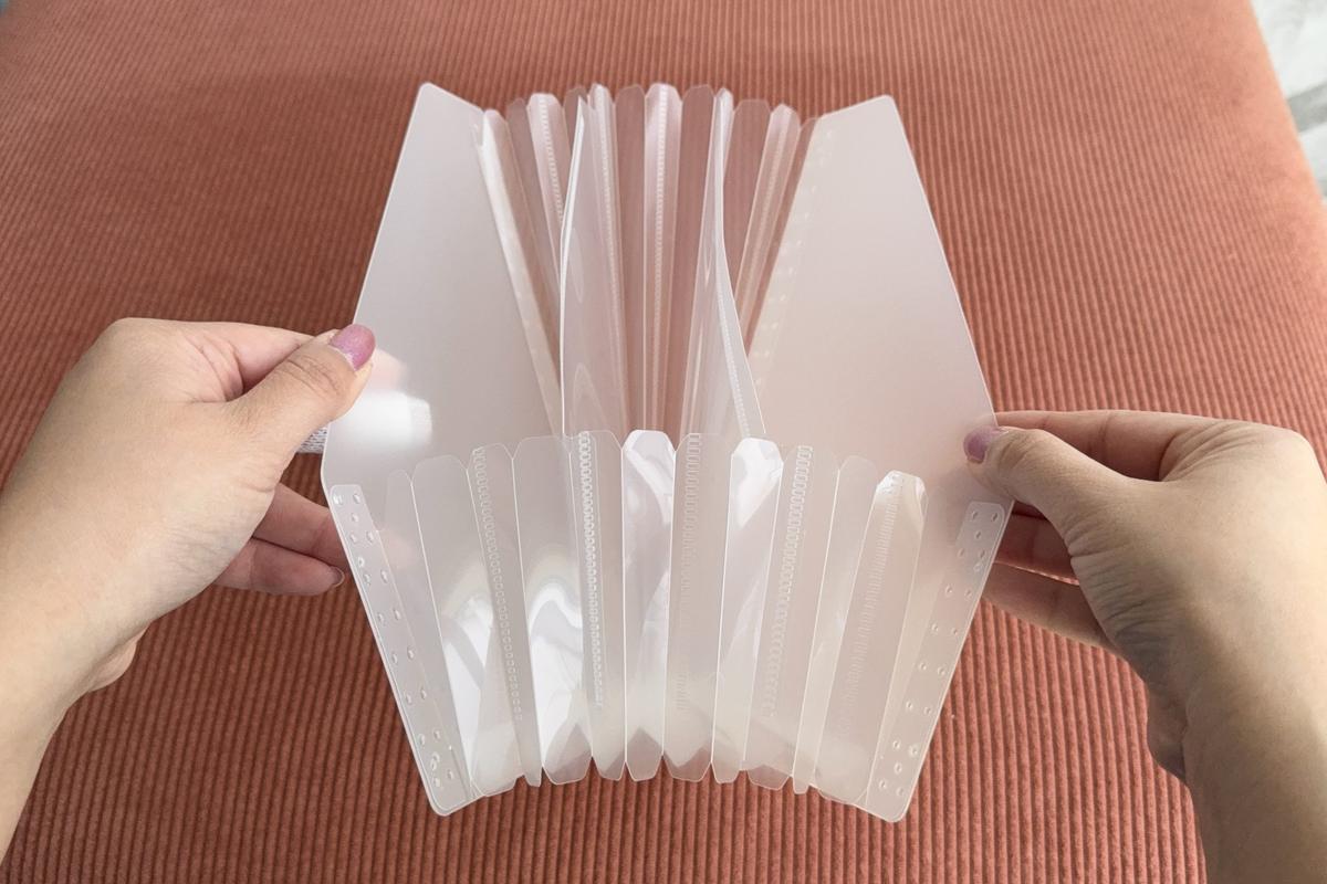 このファイルの特徴は、自立するじゃばら構造にあります。書類や小物を横向きに重ねるのではなく、立てて収納できるのがポイントです。