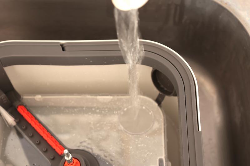 本製品の最大の特徴は、常にきれいな水でモップを洗えること。その秘密は、バケツが洗浄タンクと汚水タンクに分かれた“汚水分離式”構造になっている点です。