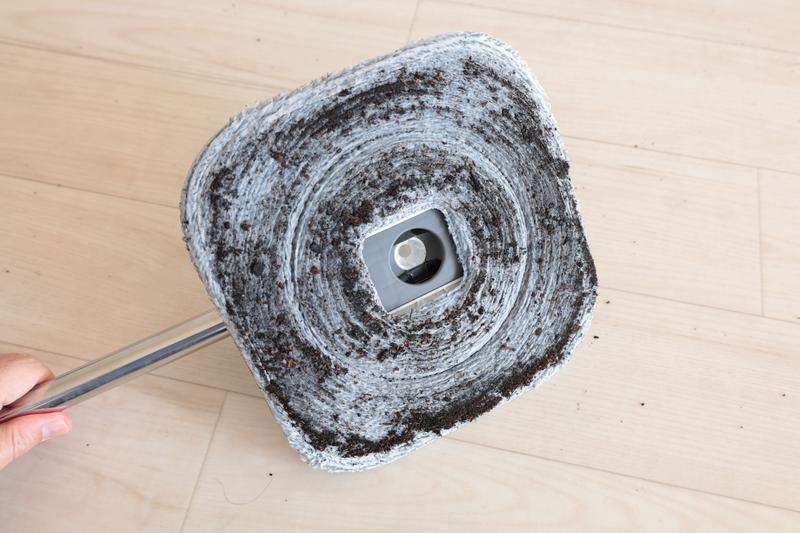 ひとしきりモップをまわしたあと、モップの表面を確認。びっしりと付着していた土が、ほぼ取り除かれています。対して、洗浄タンク内の水はあまり減っていません。