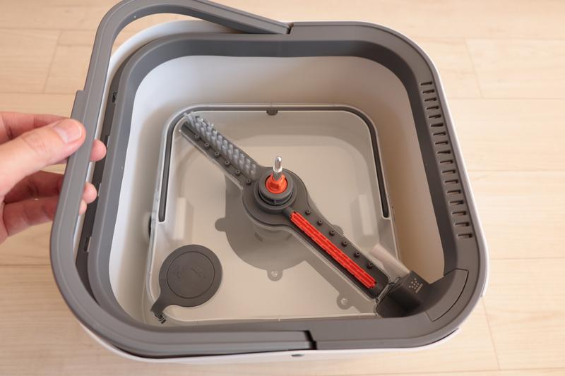 バケツはプラ製で、外周は30cm×30cm、高さは18.5cmです。内部には、透明なプラ製カバーで仕切られた洗浄タンクがあります。