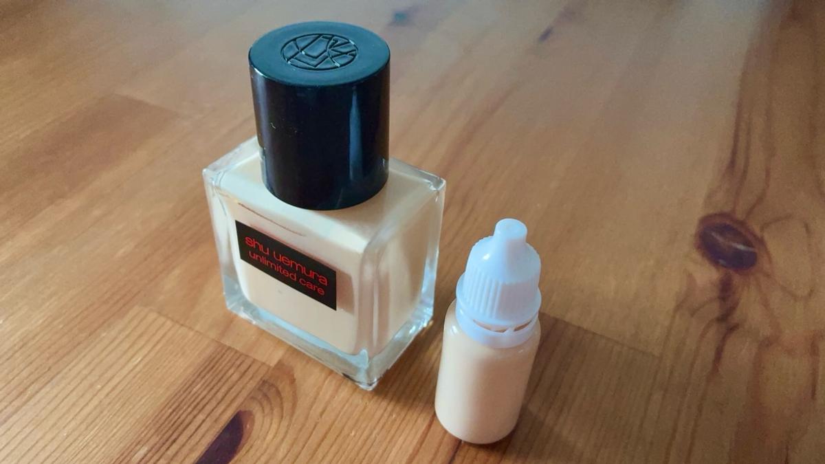 ガラス瓶に入っているリキッドファンデーションなどは、詰め替えることで容量も重さも大きくカット。