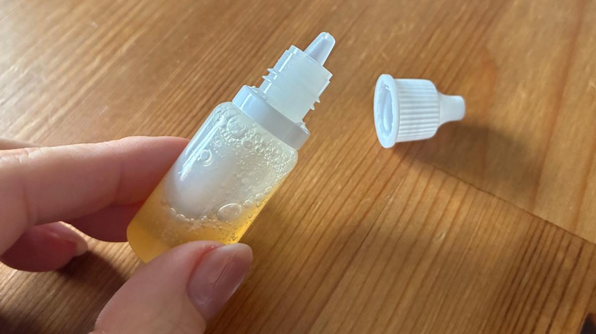 10mlは目薬より小さいサイズ感。化粧水なら2〜3泊にちょうどいいくらいの容量です。