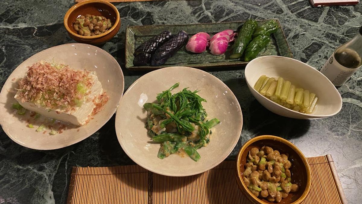 木綿豆腐、野菜の酢味噌あえ(タラの芽、サヤエンドウ、春菊)、フキ煮、ぬか漬け(きゅうり、ナス、あやめかぶ)、納豆、