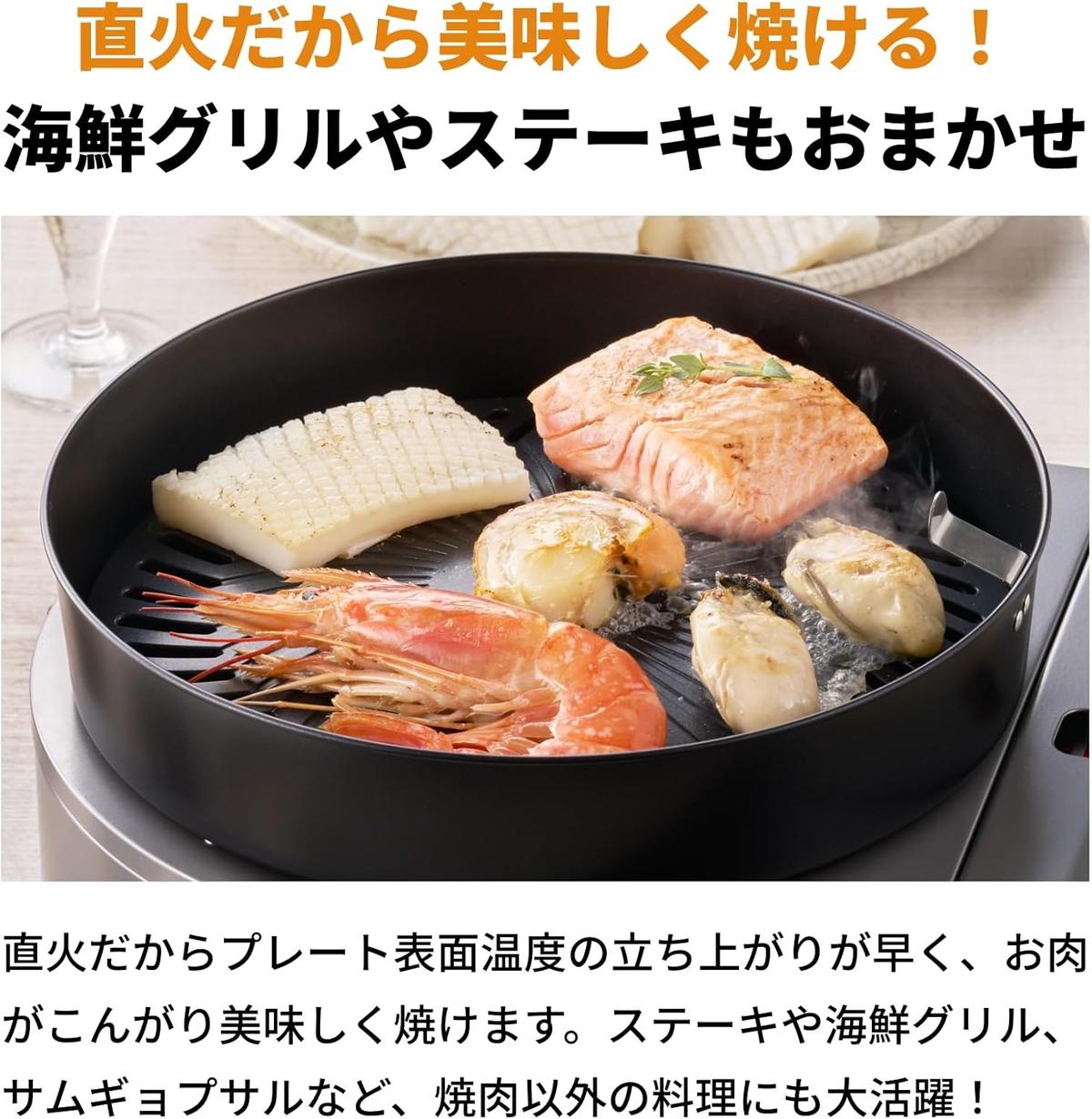 直火構造により表面温度の立ち上がりが早く、お肉をこんがり美味しく焼き上げるのもポイント。プレートはフッ素加工でこびり付きにくく、取り外して丸洗いできます。補助取っ手付きで着脱もスムーズ、後片付けまでストレスフリーですよ。