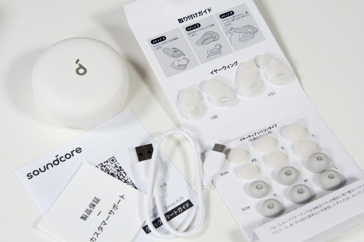 イヤホン本体に交換用のイヤーチップとイヤーウィング、充電用のUSB-C&USB-Aケーブルに保証書など。