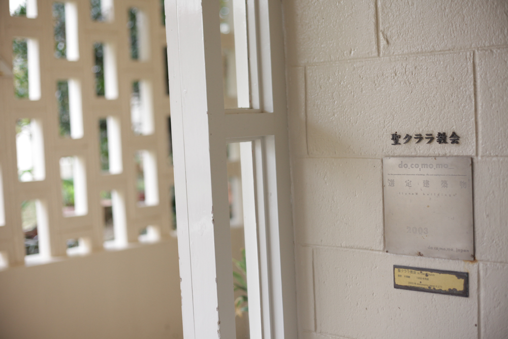 沖縄がまだ戦争の痛手から立ち直る途上にあった1958年、太平洋をのぞむ小高い丘に、アメリカの宣教師たちが教会を建てました。それが聖クララ教会です(設計は、アメリカの建築設計事務所SOMの監修のもと片岡献さんが行ったとされています)。ちなみに、モダニズム建築の保存を目指すドコモモジャパンの日本近代建築選に沖縄で初めて選ばれた教会で、信者以外にも建築ファンなどが多く訪れるとのこと。僕自身もかねてより興味のあった教会ですが、某日初めて足を運びました。
