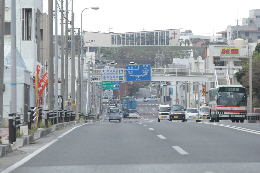 沖縄本島を南下する国道329号線の直線道路の終点、与那原交差点の丘の上に教会は建っていました。地域のどこからでも見えるこの建物は、まさに与那原のシンボルといった風情をただよわせています。与那原警察署の脇をまっすぐ入っていくと教会併設のクララ幼稚園がありその横に教会に向かう石段がありました。石段を登り切ると目の前に教会が現れます。