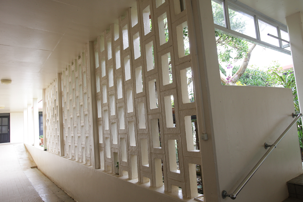 陽差しがきつい建物の西側面には穴あきブロックを施して日射を遮蔽しています。このブロックは『花ブロック』と呼ばれ、多彩なバリエーションがあり、沖縄のブロック造の特徴となっています。