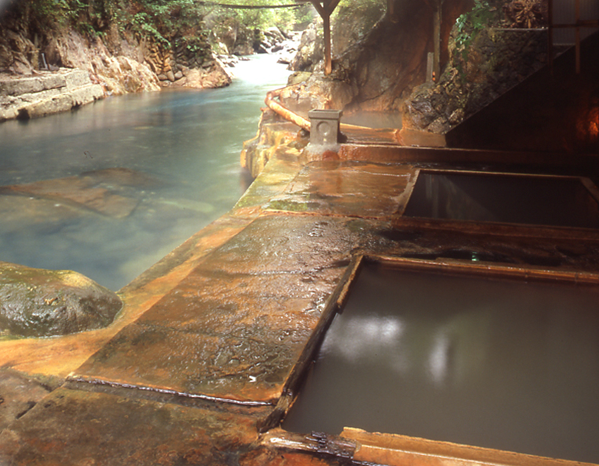 東京駅から東北新幹線とバスで2時間半、栃木県那須塩原市塩原にある明賀屋本館は混浴川岸露天風呂が有名で、TV、雑誌でも頻繁に取り上げられています。混浴の露天風呂に行くための長い階段が少々大変ですが、川阿沿いの露天風呂からの眺めは絶景。混浴可能な川岸露天風呂はタオル着用も可、朝6時~8時までは女性専用となっています。