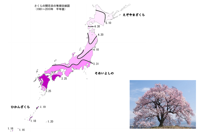 特徴:そめいよしのは江戸末期からはじまる品種で、九州から北海道の石狩平野あたりまで植栽されているといわれています。そめいよしのはえどひがんとおおしまざくらの交雑種です。そめいよしのが生育しない地域では、ひかんざくら、えぞやまざくらを観測します。