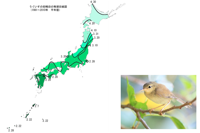 初鳴日:春にうぐいすが「ホーホケキョ」とさえずるのを初めて聞いた日