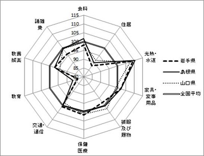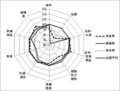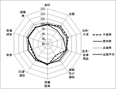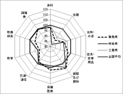 こちらの3府県では特に教育及び家具・家事用品が全国平均より高いことが分かります。