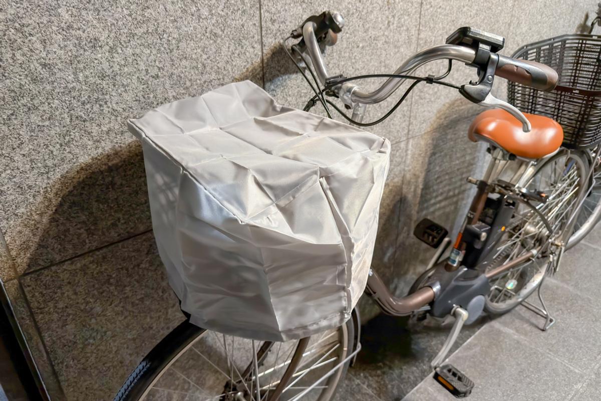写真のようにカバーを上からかぶせるだけで、カゴの中に入れたバッグや荷物をしっかりカバーしてくれます。