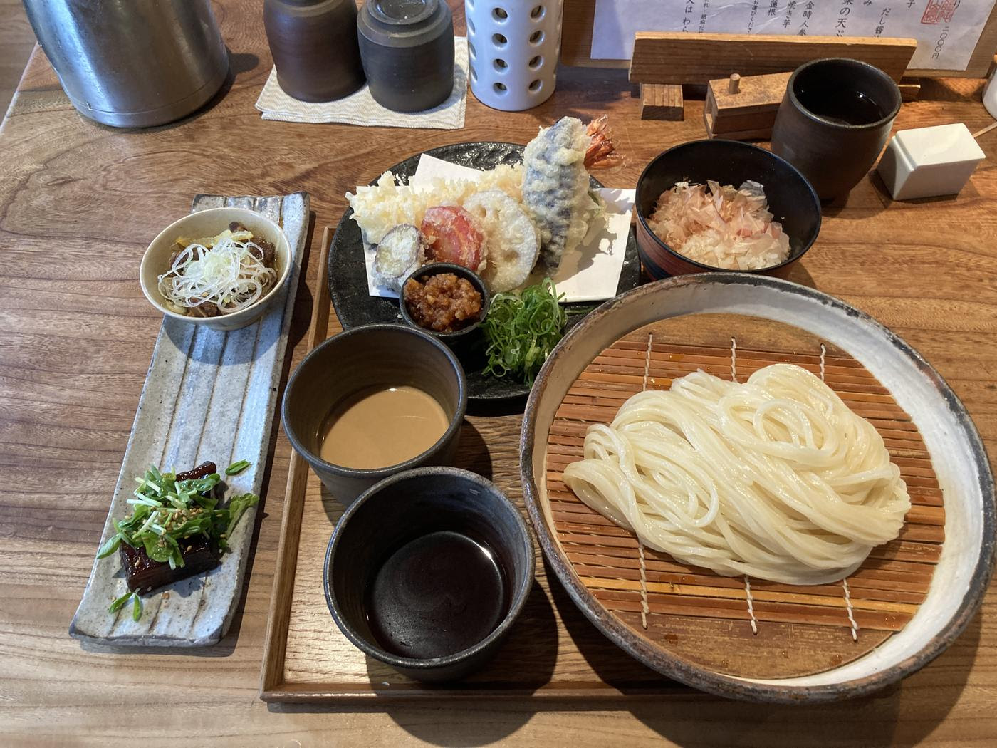 20分ほど歩いて恵比寿駅周辺に着き、スタバのRちゃんがおすすめしてくれた「うどん山長」でランチすることに。行列ができていましたが、10分ほどで中に入れました。海外のお客さんもちらほら。結論から言うと、最高のお店でした。せっかくなので単品ではなく、「山長ひと通り」(2,000円)というランチのお得なセットを注文。このコスパの高さに驚きました。