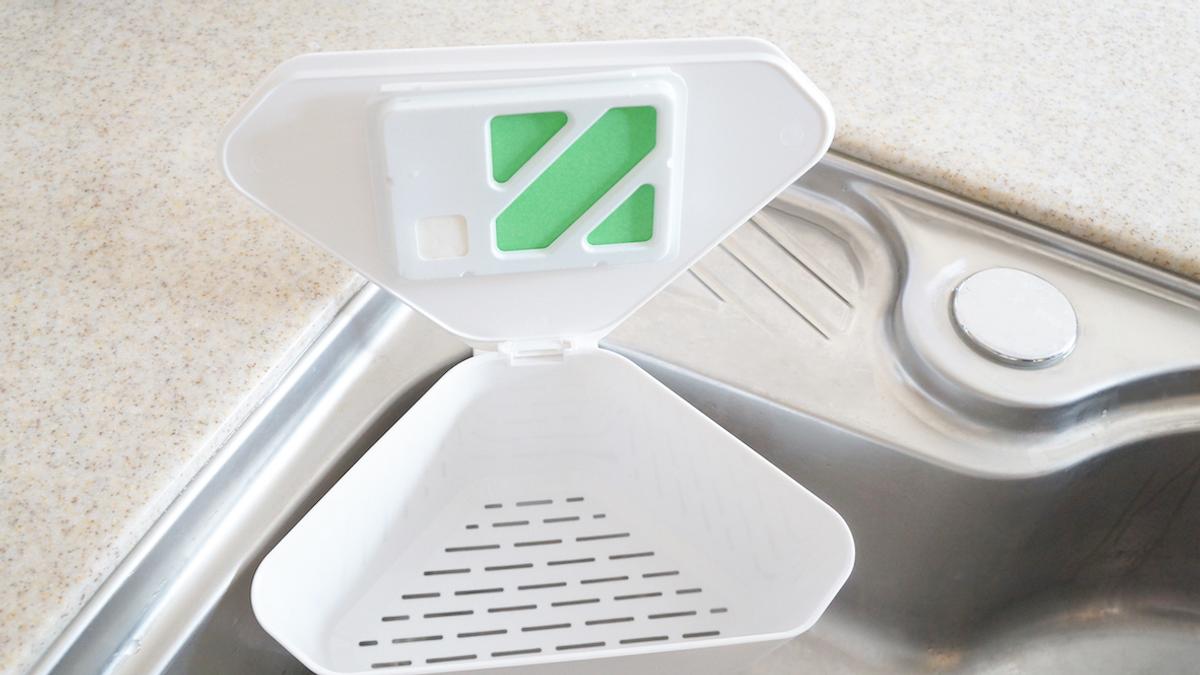 山崎実業の「浮かせるフタ付き三角コーナー」は、臭いや害虫を防ぎながらシンク内を清潔に保つことができる優れもの。