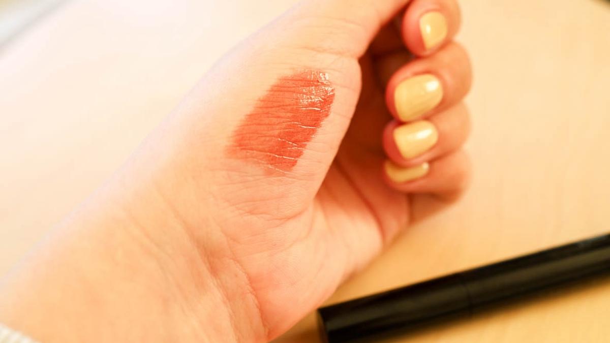 G03というカラーはオレンジすぎず、ブラウンすぎずな絶妙なカラーで、塗るだけでなんとなく雰囲気が出るような。濃すぎないので顔からも浮かず、秋冬にぴったりのカラーだと思いました。