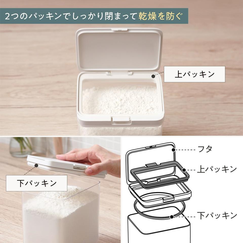 小麦粉(袋ごと)約1kg、小麦粉(粉のみ)約1.2kg、シリアル約600gが入る2Lサイズで、容量たっぷりの保存容器です。