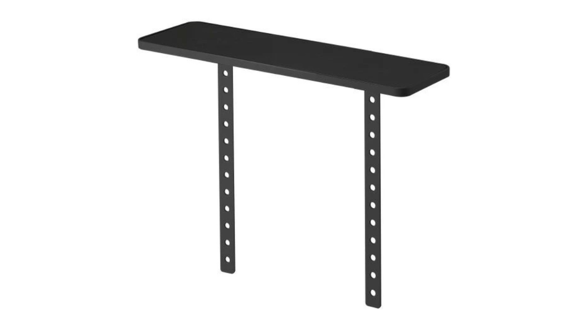 本体サイズは約W40×D12×H35.5cm、商品重量は約900g。ワイド40cmの棚板は、スマートスピーカー(AIスピーカー)やリモコン、外付けHDD、ゲーム周辺機器までまとめて設置できます。耐荷重は約2kgと、ルーターや電源タップの収納にも対応。素材はスチール(粉体塗装)で、付属のシリコーンマットにより機器の滑りを抑制します。