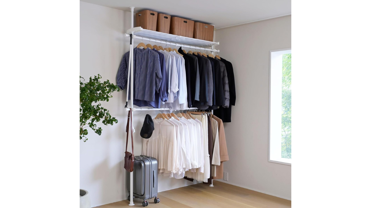幅103〜160cm×高さ190〜260cmに伸縮し、天井まで使い切ることができる山善(YAMAZEN)の「突っ張りハンガーラック ダブル伸縮棚付き WJT-775R」がAmazonで6%オフに!