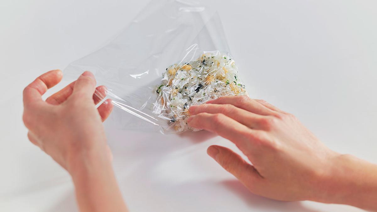 炊き立てのごはんを「サランラップ®」でつつむ。
