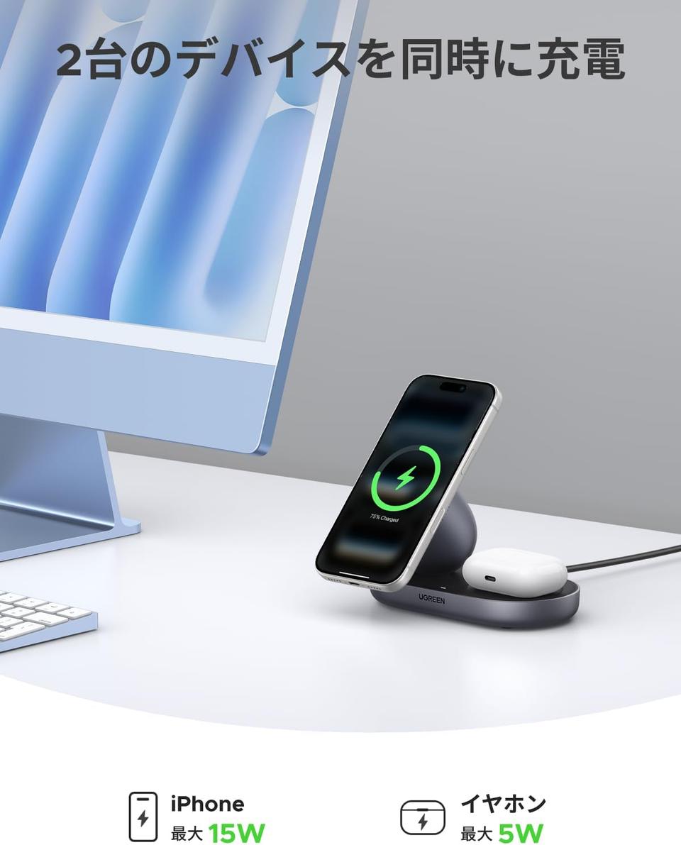 デスクの上、充電ケーブルだらけでごちゃごちゃ…。そんなストレスから解放してくれるアイテムがこちら。UGREEN(ユーグリーン)の「 Zapix ワイヤレス充電器 MagSafe 15W Qi2認証 2-in-1」です。