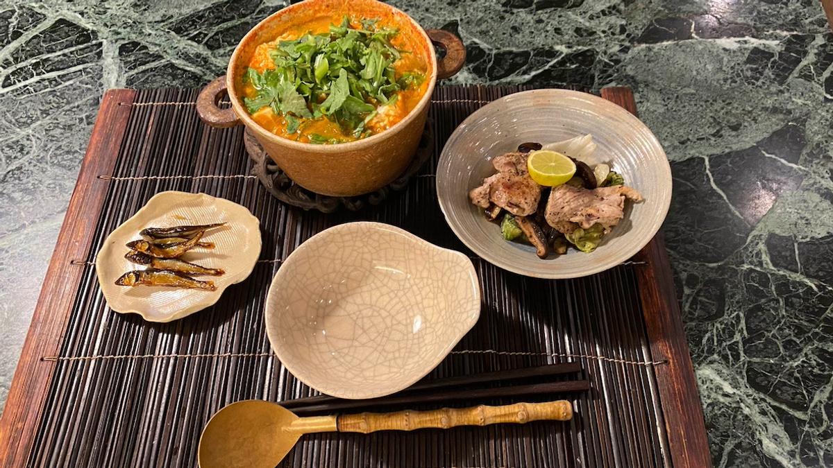 ひとりごはん。豆腐チゲもどきのチゲ、レタスとなすと豚肉炒め、琵琶湖で生まれた「若あゆ」と「本もろこ」、いただきました。甘じょっぱくて美味しい。懐かしい味わい。