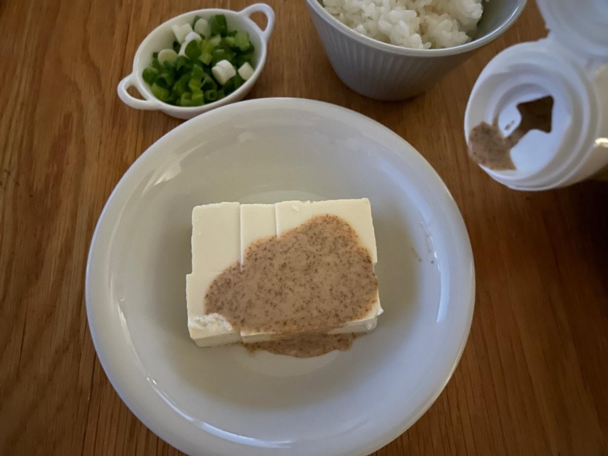 1.豆腐を適当な大きさに切って、ごまドレッシングをかけます。