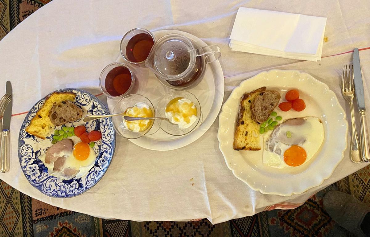 ヨーグルトとチャイ。目玉焼き、ハム、レーズンパン、パネトーネ。こういう朝ごはんも魅力的よねえ。