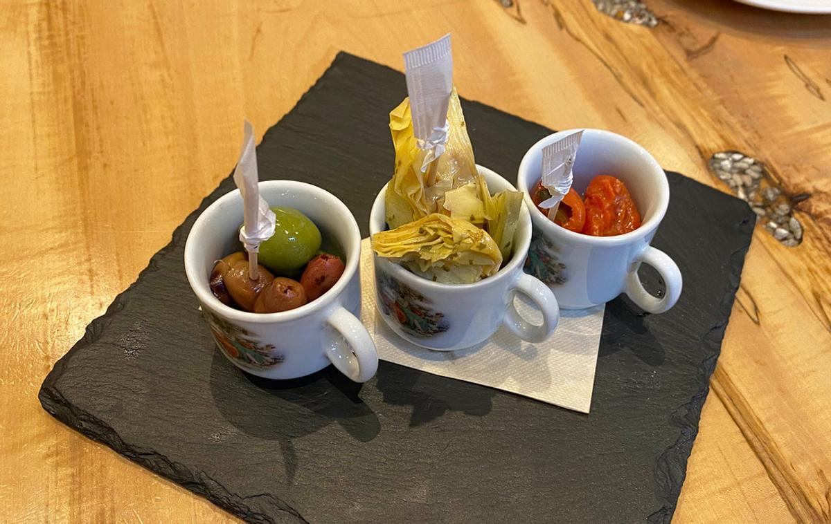 ミニおつまみ(オリーブ、カルチョフィ、ドライトマト)(このセット、いいです!)。TOSCANAの白ワイン。