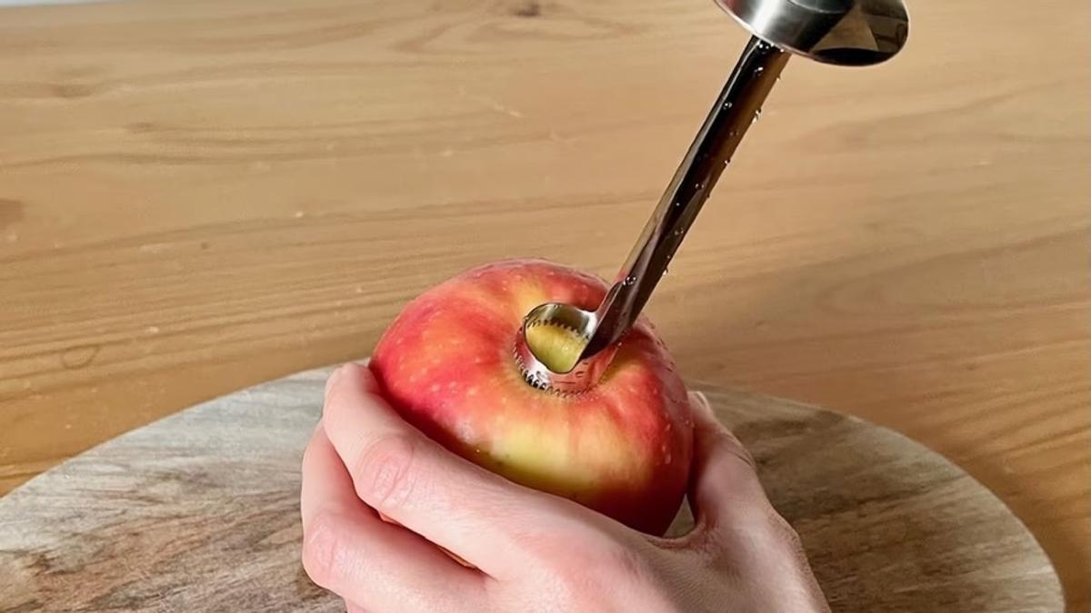 使い方は簡単で、片手でりんごを押さえながら、芯にコアラーを差し込み回していきます。