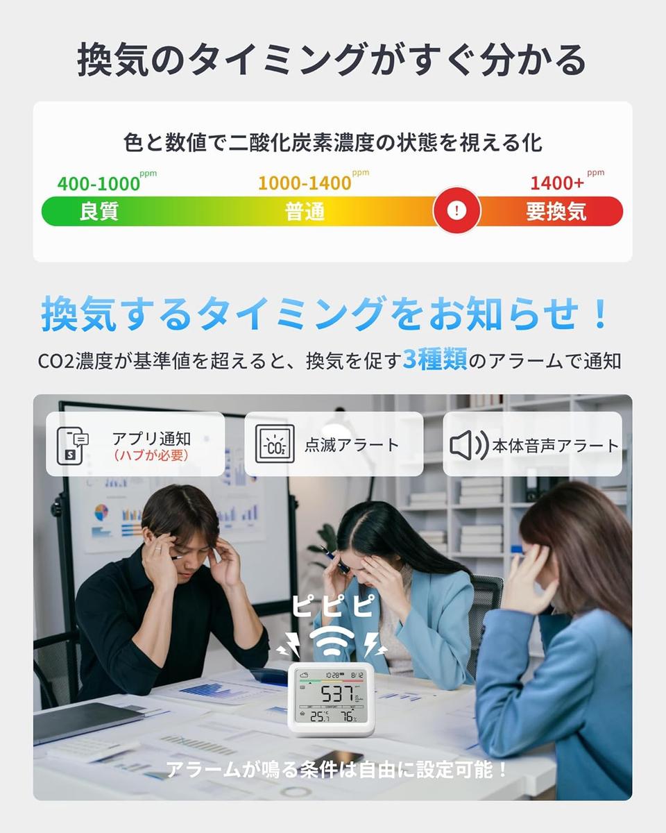 CO2濃度や温湿度が設定値を超えた際にアラートで知らせてくれるのも便利。警告音、ディスプレイ点滅、アプリ通知(※SwitchBotハブ製品が必要)の3段階のアラート機能により、外出先からでも空気の状態を把握可能。換気のタイミングを逃しません。