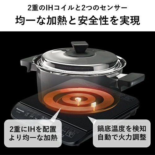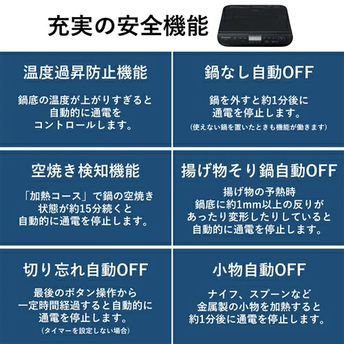 鍋底の温度が上がりすぎたり、鍋を外した状態が続くと自動的に停止する「温度過昇防止」や「鍋なし自動オフ」を内蔵。