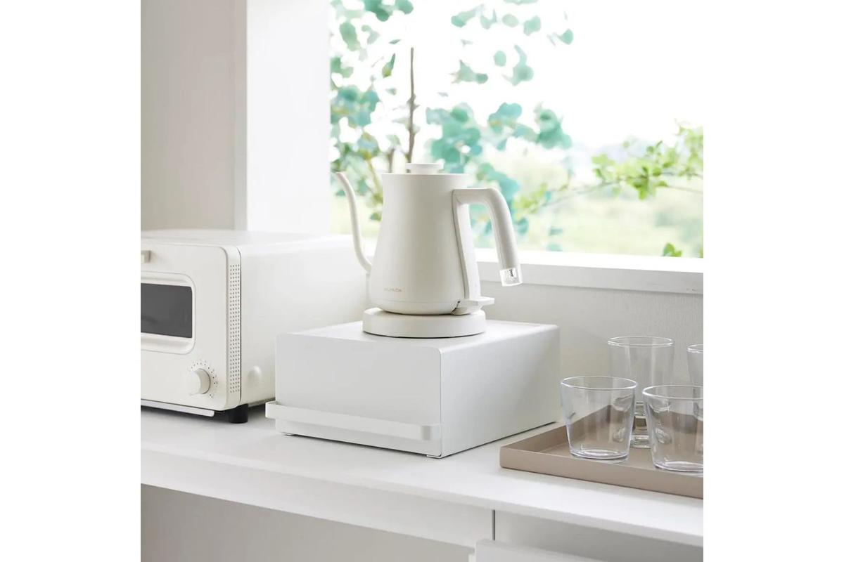 山崎実業(Yamazaki)の「引き出し付きキッチン家電下ラック タワー」は、電気ケトルやコーヒーメーカーの下を収納に変える引き出し付き設計で、デッドスペースを有効活用できるキッチンラック。
