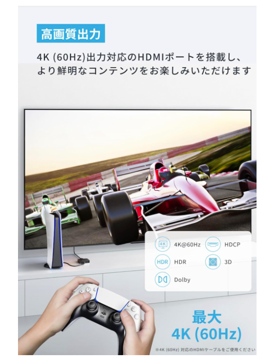 4K(60Hz)出力対応のHDMIポートを搭載し、より鮮明なコンテンツを楽しめます。