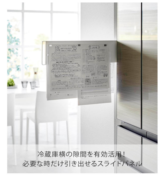 「マグネット冷蔵庫横隠せるスライドスチールパネル」は、冷蔵庫横に取り付けて必要な時だけ引き出せるスライドパネルです。