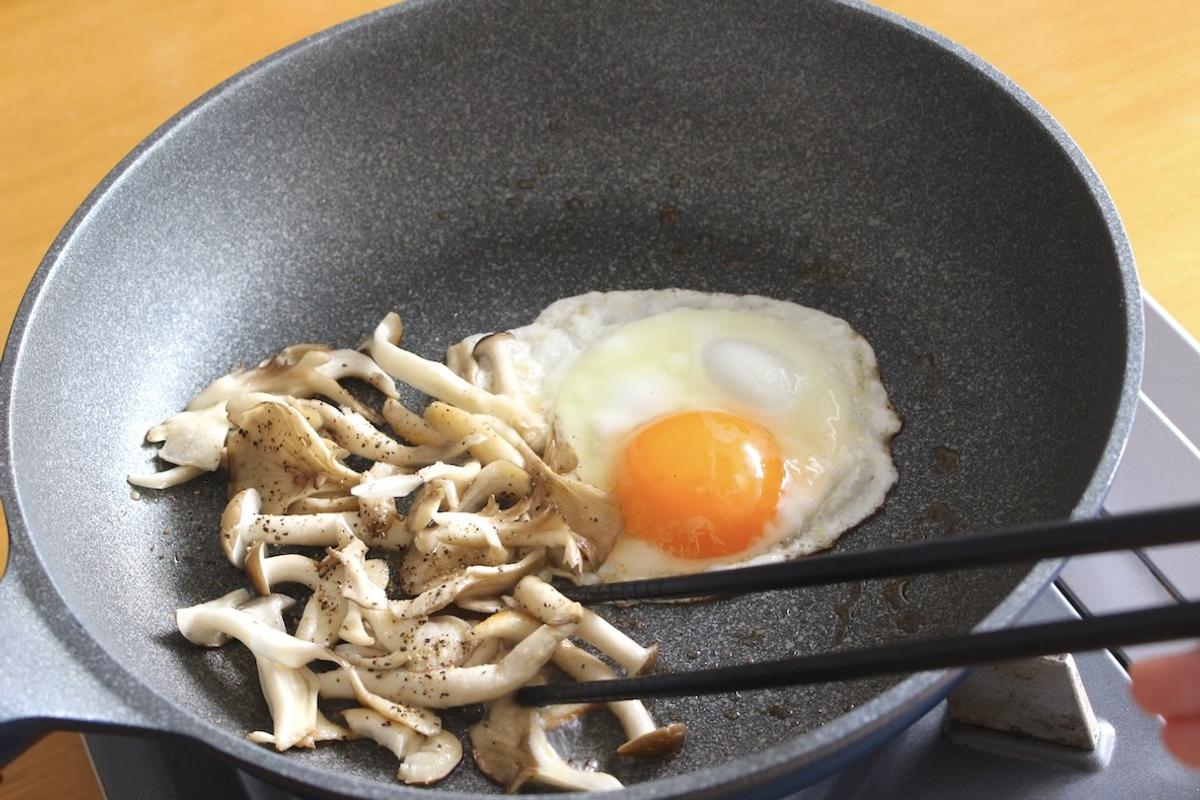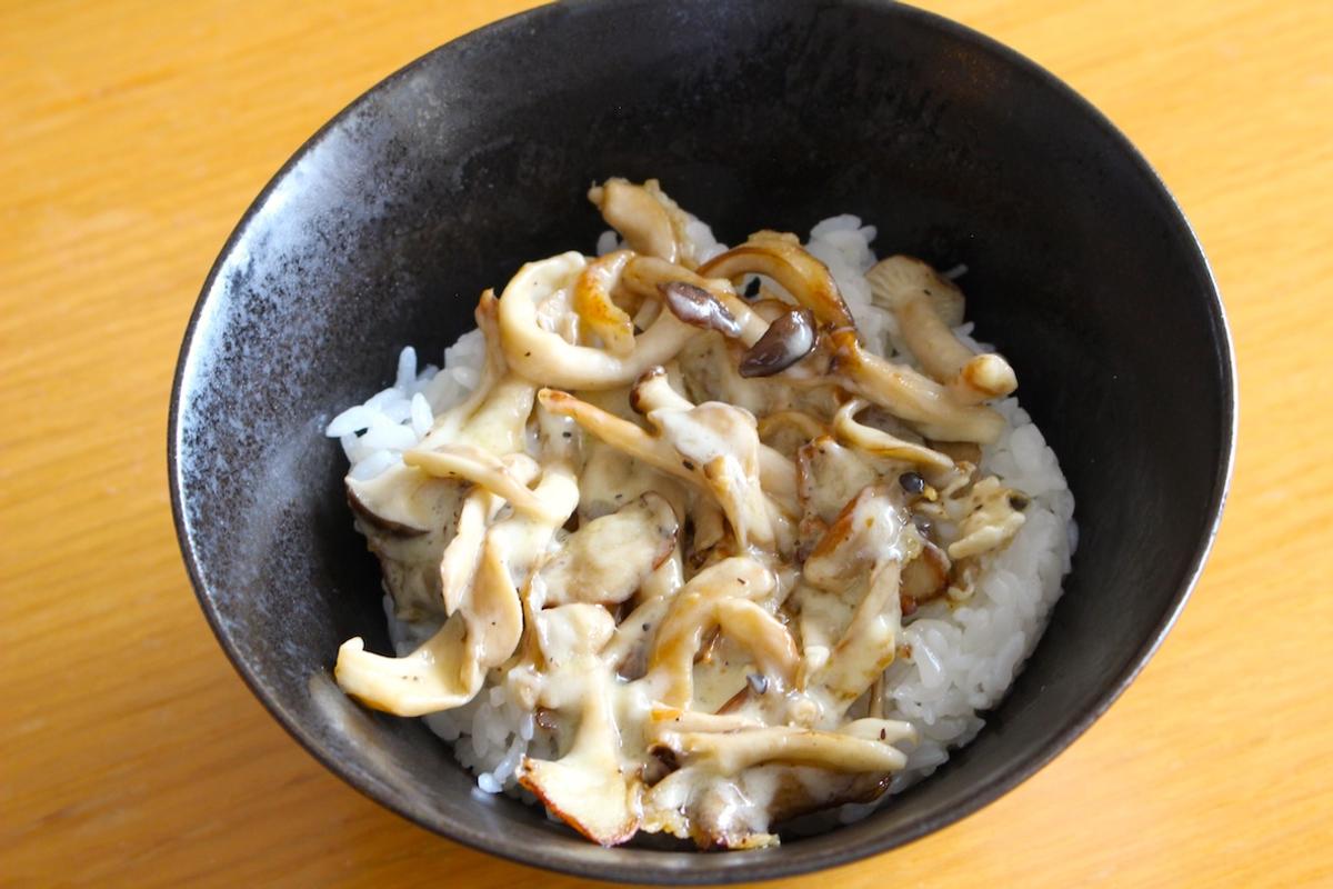 目玉焼きの黄身を割ってごはんと混ぜながら食べれば、バターとキノコの風味とチーズのコクが効いた、香ばしい卵かけごはんみたいな雰囲気に。