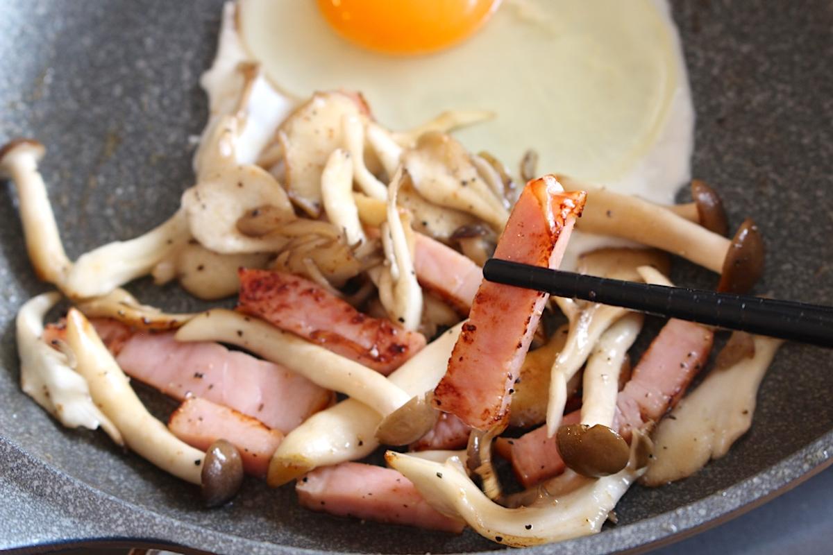 2. 熱したフライパンにバターを落とし、キノコを入れて塩コショウして加熱。その隣に卵を割り入れて目玉焼きを作る。